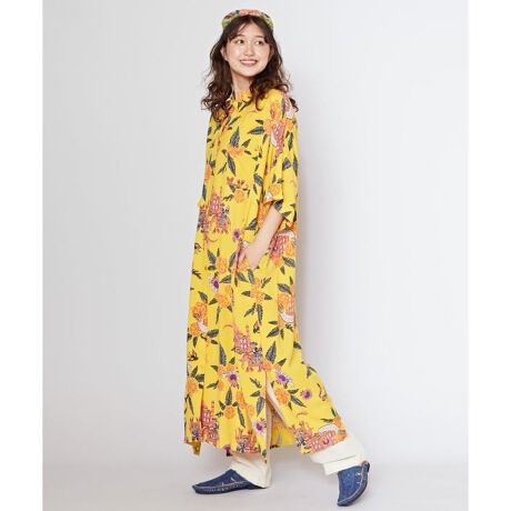 メキシコとインドのモチーフが融合した2WAYタイプの着用が出来るワンピース。旅するカラベラがゾウに乗ってインドへ訪問。神聖な意味を持つマリーゴールドはインドとメキシコには欠かせない花です。アロハ柄、花柄に挑戦してみたい方へおすすめ。裾のスリットで着やすさアップ。さらっと着られて涼しいレーヨン素材。