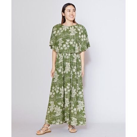 タパとヤシを重ねたヴィンテージ感のある柄のケープ付きワンピース。ケープとのセット着用でリゾート挙式に、ワンピース単体でTシャツなどと重ねてタウンユースにと様々なシーンで活躍します。ケープはどちらを前にしても着られる2WAY仕様で、肩のスナップでずれないように止めることができます。
