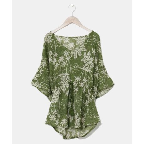 [型番:4IA-5235-2025]タパとヤシを重ねたビンテージ感のある柄のUVカット機能付きのトップス。ウエストの紐で調整可能です。カジュアルなスタイルにも、結婚式などの場面にもおすすめです。UVカット加工