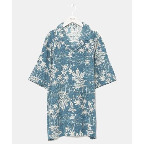 タパとヤシを重ねたビンテージ感のある柄のメンズアロハシャツ。ボタンを開けて羽織りとしても活躍します。