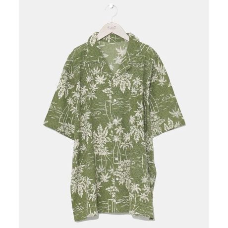 [型番:4IA-5239-2025]タパとヤシを重ねたビンテージ感のある柄のメンズアロハシャツ。ボタンを開けて羽織りとしても活躍します。