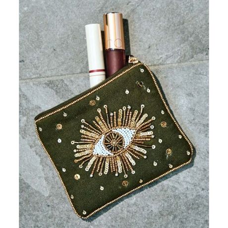 [型番:IGFP5201-2025]キャッチーなアイモチーフのポーチ。キラキラ光るビーズ刺しゅうはインドのハンドクラフト。コンパクトで持ち運びしやすく、アクセサリーや小物入れとしてピッタリのアイテムです。