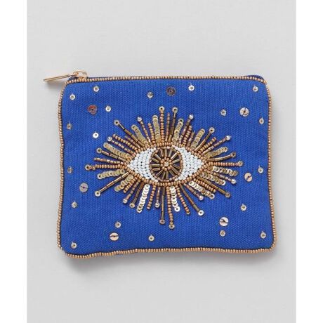 [型番:IGFP5201-2025]キャッチーなアイモチーフのポーチ。キラキラ光るビーズ刺しゅうはインドのハンドクラフト。コンパクトで持ち運びしやすく、アクセサリーや小物入れとしてピッタリのアイテムです。