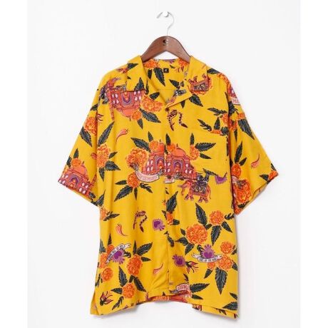 旅するカラベラがゾウに乗ってインドへ訪問。メキシコとインドのモチーフが融合した一枚。神聖な意味を持つマリーゴールドはインドとメキシコには欠かせない花です。アロハシャツ、花柄シャツに挑戦してみたい方へおすすめ。ゆったりとした身幅のメンズシャツ。開襟シャツで首回りも涼しく、さらっと着られて涼しいレーヨン素材。