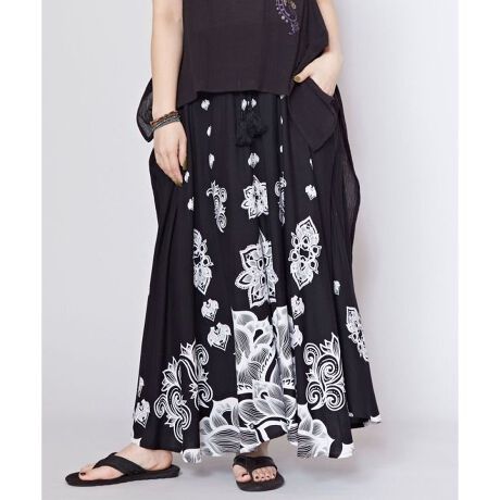 【Amina×VORRUK】タイのアーティストVORRUKとのコラボ。力強いロータスの絵を単色のプリントで落とし込んだ変形のスカート。柔らかくて涼しいレーヨン素材で着心地抜群。たっぷりしたドレープで動きのあるシルエットが出せる。普段のコーディネートにも合わせやすい大胆なアイテム。