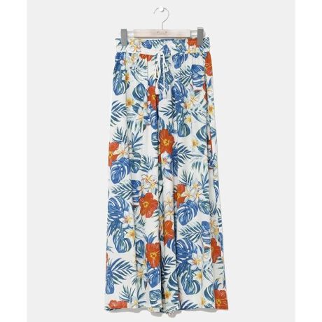 [型番:4IA-5232-2025]鮮やかなカラーリングのワイドパンツ。大きめのハイビスカスやモンステラ、ラメプリントがポイント。