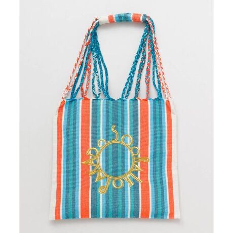 南インドの織り生地を使ったハンモック調のトートバック。金糸の刺しゅうはCATCH THE SUNのヒンディ語、SOORAJ KO PAKADOと書かれています。太陽の光をふんだんに浴びた南インドならではの風合いを日常に取り込めるアイテムです。