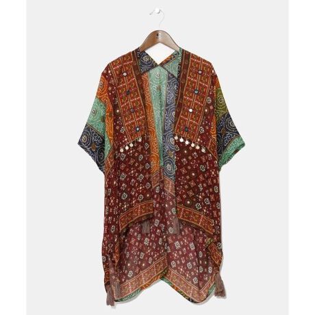UVカット加工付きの薄いレーヨン素材のカーディガン。インドの伝統的な技法や柄をプリントし、魔よけのお守りであるミラーワークや、コインチャーム、タッセルなどの装飾を施したシリーズ。おしゃれをしながら、日差し対策も出来るアイテム。ダマスク:植物や花柄、果物などを繋げてくり返すようなデザイン。アジュラック:ブロックプリントの一種で、藍や茜などの天然染料を使用して染色されたシックな色合いが特徴。グジャラート:グジャラート州のバンジャラ族の刺しゅうがモチーフ。タイダイ:バンダニと呼ばれる豆絞り染。アラベスク:インドのモスクにも描かれている終わりのない花などの植物柄。