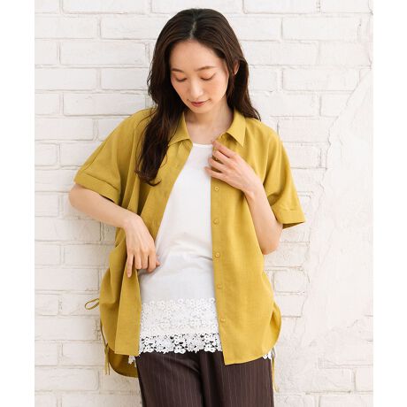 くしゅっと寄せたギャザーとサイドリボンが印象的な、ドローストリングデザインのリネンライクシャツ。