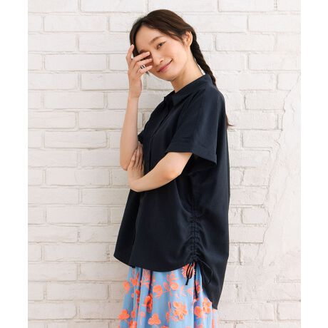 くしゅっと寄せたギャザーとサイドリボンが印象的な、ドローストリングデザインのリネンライクシャツ。