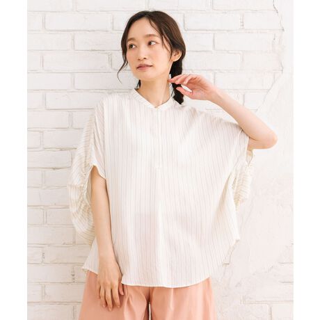 上品なストライプ柄とふんわりとした袖のボリューム感が目を引くダブスストライプギャザーブラウス。