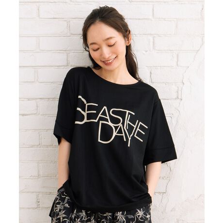 「SEAS THE DAY」のポジティブなメッセージが、シンプルなコーディネートにアクセントをプラスします。