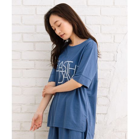 「SEAS THE DAY」のポジティブなメッセージが、シンプルなコーディネートにアクセントをプラスします。