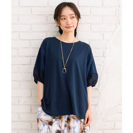 身頃はシンプルな無地で着まわしやすく、袖部分にはレースと布帛を重ねたボリュームスリーブが華やかな印象に。