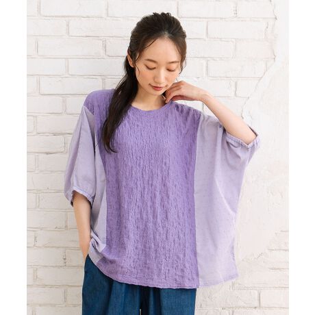 表情のある凹凸素材にドット柄の異素材スリーブを組み合わせた、存在感のあるワッシャー×ドビーコンビトップス。