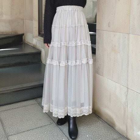 レース使いと、ボリュームたっぷりのチュールが目を惹くスカート。