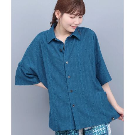 ストライプにさりげない幾何学模様が映える、go slow caravan のルーズな半袖シャツ。