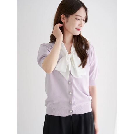 パールボタン×ラインストーンがフェミニンムードたっぷりなカーディガン