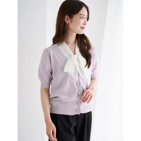 パールボタン×ラインストーンがフェミニンムードたっぷりなカーディガン