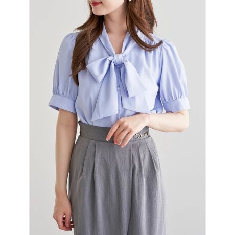 ふんわりとしたボウタイリボンが上品な印象のキレイ見えブラウス