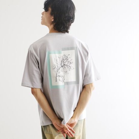 フロントはシンプルに、バックスタイルはの大胆に配したプリントが特徴的な一枚。