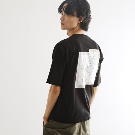 フロントはシンプルに、バックスタイルはの大胆に配したプリントが特徴的な一枚。