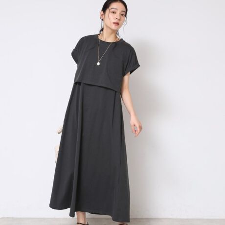 シンプルなテントラインのワンピースにショートトップスのTシャツがセットになったワンピースです。