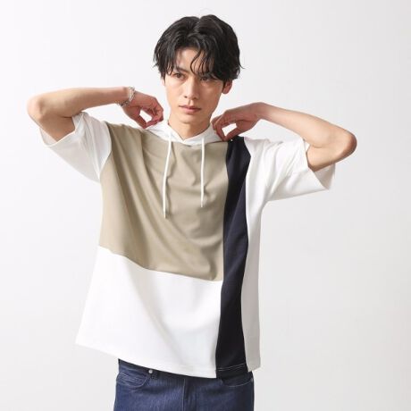 異素材を組み合わせたブロッキングデザインが特徴的な半袖パーカ。