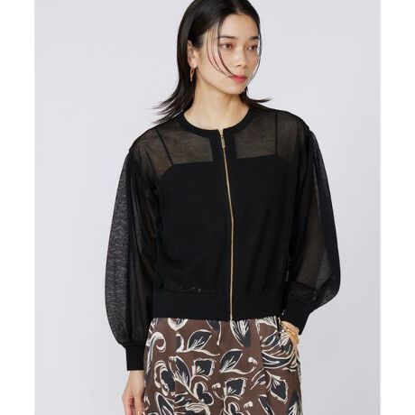 ■デザイン清涼感があり軽やかに仕上げたシアー感のあるジップアップニットカーディガン。ギャザーをふんだんに施したボリュームのあるシルエットがポイント。カーディガンとしてはもちろん、ジップを閉めてプルオーバーとして着るのもお勧め。大人っぽい可愛さ、スポーティ感、シアー感が1枚でも様になる着こなしを演出します。■素材ビスコースをベースにポリエステルを撚糸させた細番手の糸は、張り感があり程よいしなやかさを演出します。軽く通気性も良いのが特徴で、ツルっとした表面感は、すっきりしていて上品な光沢も兼ね備えています。・水洗い可■サンプル撮影商品こちらの商品はサンプルでの撮影となっております。実際の商品とは、サイズや色味、素材、デザイン等の仕様が若干変更になる場合がございます。