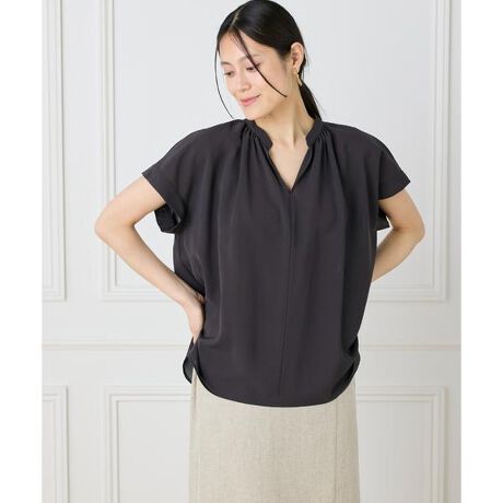 ■デザイン大人のキレイめコーデにはマストのキーネックブラウス。ドライタッチでドレープ性のある素材を使用し、全体にゆとりがありながらもすっきりと着用頂けるサイズ感です。暑い夏にも涼しく着て頂けます。二の腕をカバーするワイドフォルムがトレンド感と気負わない着ごこちを両立。衿のギャザーが顔まわりを華やかに見せてくれます。前後長さの違うヘムラインにサイドスリットでスタイルアップ効果も。■素材ドライタッチでドレープ性の高いアセテートに、ストレッチ性のあるコンジュケートポリエステルを撚糸し、1つの糸に合わせ織り上げました。撚糸設備を持つ工場こそができる日本ならではのモノづくりです。・水洗い可■サンプル撮影商品画像の商品はサンプルです。実際の商品とはサイズや色味、素材、デザイン等の仕様が若干変更になる場合がございます。■カラーについては、可能な限り実際の商品に近いカラーで撮影をおこなっておりますが、照明の関係により実際の製品とは色味が違って見える場合があります。またパソコン・スマートフォンなどの環境により、若干製品と画像のカラーが異なる場合もございます。現物と画像のカラー差異については返品理由となりませんので、予めご了承ください。■サイズ表記はあくまで目安となります。