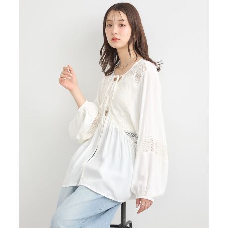 滑らかなレーヨン生地に華やかなレースをジョイントしたブラウス。フロントのリボンとヘムラインのフレアシルエットが女性らしいデザインです。ボリューム袖に加えたレースアクセントも目を惹くポイント。ヘルシーな肌見せとシーズナルなレイヤードスタイルが楽しめるおすすめのトップスです。透け感[あり]