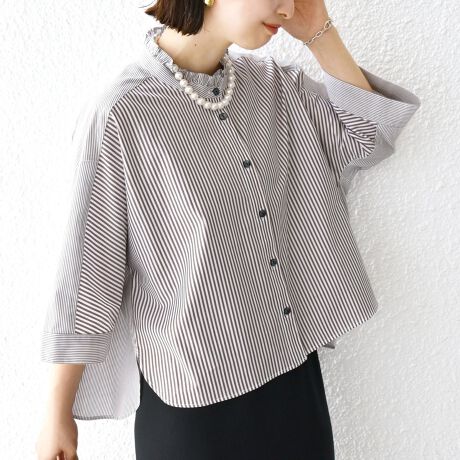 襟もとのさりげないフリルや太・細ストライプの切り替えが目を惹くデザインです。