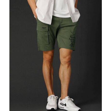 フロントにインパクトのあるレタリングプリントを入れた目を引くデザイン。右腿の横に取り付けた大きなカーゴポケットもアクセントになっています。スナップボタン付きのフラップもあるのでポケットの中身を落とす心配もありません。ヒップポケットにもフラップとマジックテープを付けております。さらに左腿サイドには止水ジップ付きのポケットも搭載。ゴルフやテニスなどのプレー中にボールを収納しておけるポケットを多数備えた収納力抜群の一本に仕上げております。フロントのプリント以外にもところどころにラバーワッペンやプリントが散りばめられた、遊び心を感じさせるデザインも魅力的です。