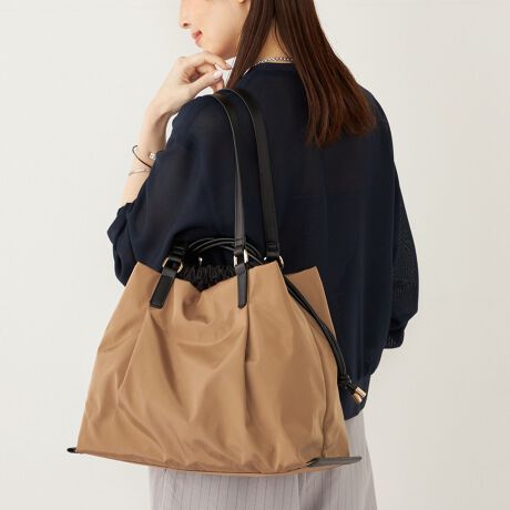 巾着の両外側も収納可能な仕様と、巾着の内側に2つのポケットを施した、荷物の整理がしやすい実用性の高さが魅力の綺麗めバッグ。