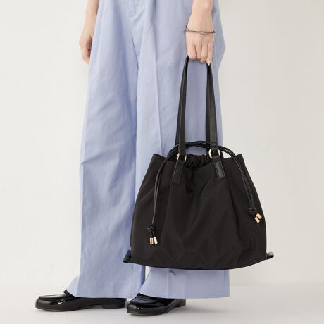 巾着の両外側も収納可能な仕様と、巾着の内側に2つのポケットを施した、荷物の整理がしやすい実用性の高さが魅力の綺麗めバッグ。