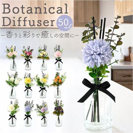 【香りが心地よく広がるインテリア】暮らしを彩り、素敵空間を演出☆ナチュラルでおしゃれな「ボタニカルディフューザー」。【華やかに香るディフューザー】ガラスのフラワーベースにフェイクフラワーを飾りながら、香りを楽しめるアイテム♪【手軽にセット!火を使わず安全】ボトルに入れたオイルにスティックを挿し、吸い上げて拡散。約1〜1.5ヶ月香りが持続。(※)芳香期間は目安です。使用環境によっても異なります。【毎日の生活にお気に入りの癒しを】お部屋や玄関先などにお花と香りをプラスすることで、いつもの暮らしがより豊かに。【頑張っている人へのご褒美に】自分用にはもちろん!慌ただしい毎日を送る方へ、香りのギフトを。【香りのラインナップ】フルーティー:フレッシュな柑橘系の爽やかな香り。(※)ポンポンマムホワイト/ブーケホワイト/ローズアイボリーティーフローラル:穏やかで心が癒される紅茶の香り。(※)ポンポンマムイエロー/ブーケイエロー/ローズオレンジピーチ:みずみずしいピーチの優しい香り。(※)ポンポンマムピンク/ブーケピンク/ローズピンクざくろ:酸味のあるベリー系の香り。(※)ポンポンマムブルー/ブーケブルー/ローズバイオレット