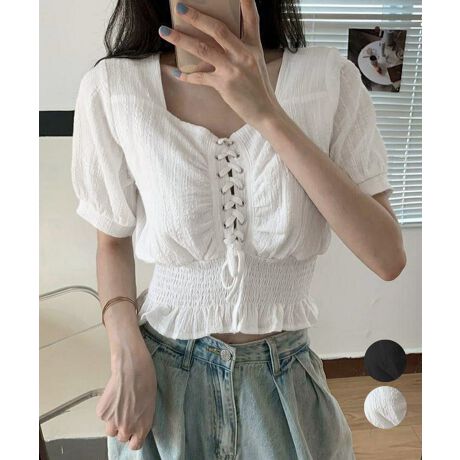 フロントのレースアップがフェミニンなアクセントをプラスするブラウス。