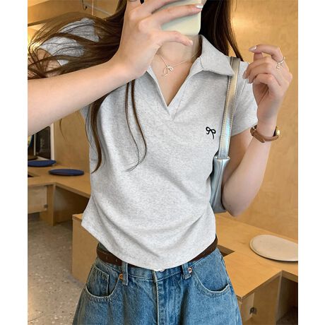 清楚感あふれるVネックリボン刺繍入りポロシャツ。