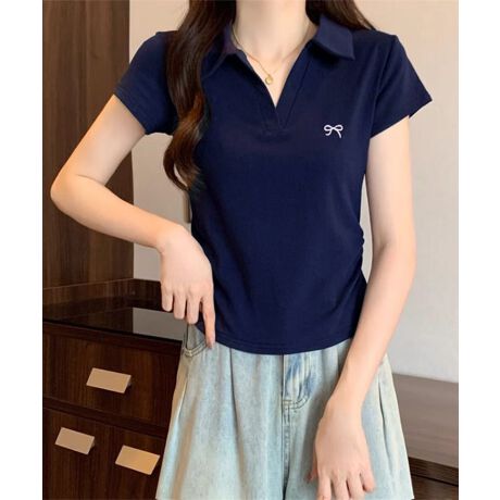 清楚感あふれるVネックリボン刺繍入りポロシャツ。