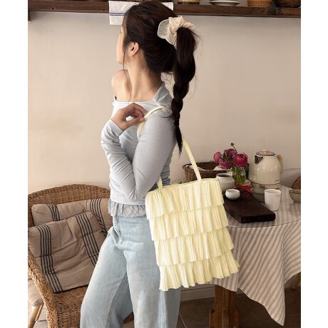 華やかなフリルが目を引くプリーツデザイントートバッグ。