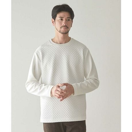 身頃にふくれジャガードバスケット柄、袖にライトダンボール素材を合わせた異素材ドッキングTee。