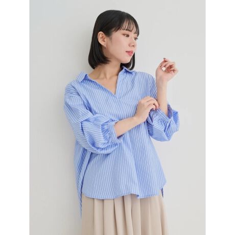 ストライプ柄が爽やかなデザイン性の高いボリュームスリーブのスキッパーシャツ。