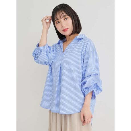 ストライプ柄が爽やかなデザイン性の高いボリュームスリーブのスキッパーシャツ。