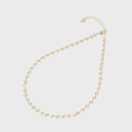 華やかな印象を与えるこのネックレスは、繊細なチェーンデザインとゴールドの輝きが特徴。