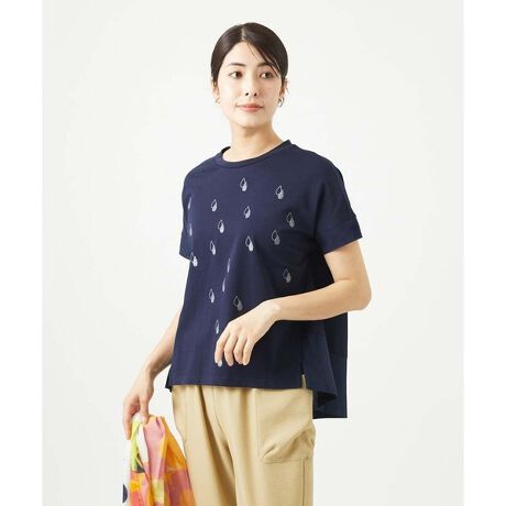 ラメプリントがコーディネートのアクセントになってくれるカットソー。ベーシックなホワイトとネイビーの2色展開で、パンツもスカートも合わせやすく、使い勝手の良いアイテムです。しずくデザインとマッチする梅雨時にはもちろん、肌触りの良いコットン生地で、夏の間にも活躍すること間違いなしです。