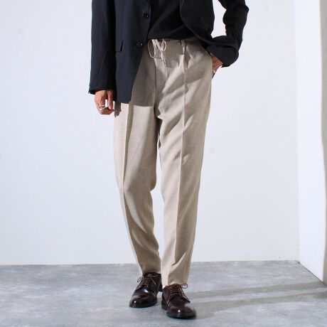 リネンライクなポリエステル糸を使用した生地を採用したイージーパンツ。