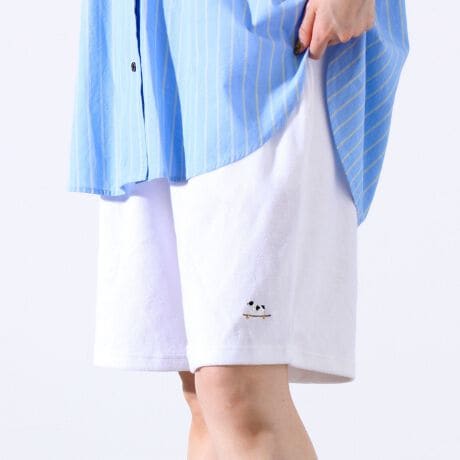 スケボーに乗ったフレンチブルドッグ刺繍がポイントの、遊び心あふれるパイルショーツ。