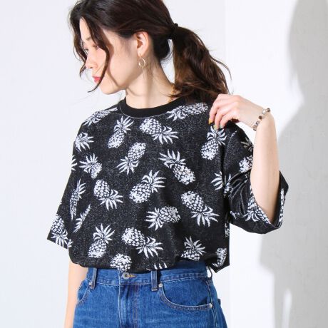 ・パイナップル柄は主役級なのでシンプルなデニムパンツや無地ショーツと合わせてメリハリをつけるのが◎。