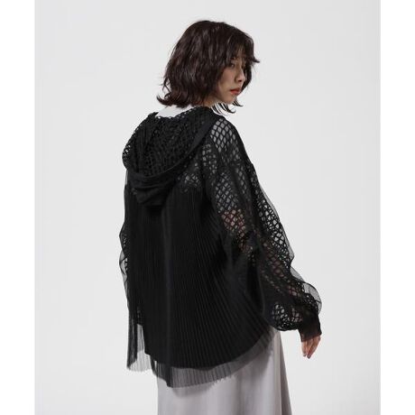ビックメッシュが目を惹くジップアップフーディは、バッグスタイルのプリーツデザインがポイント。