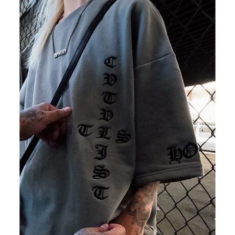 ネックはリブ編み仕立て、ボディはゆったりとしたリラックスシルエットでストリートライクな仕上がりです。